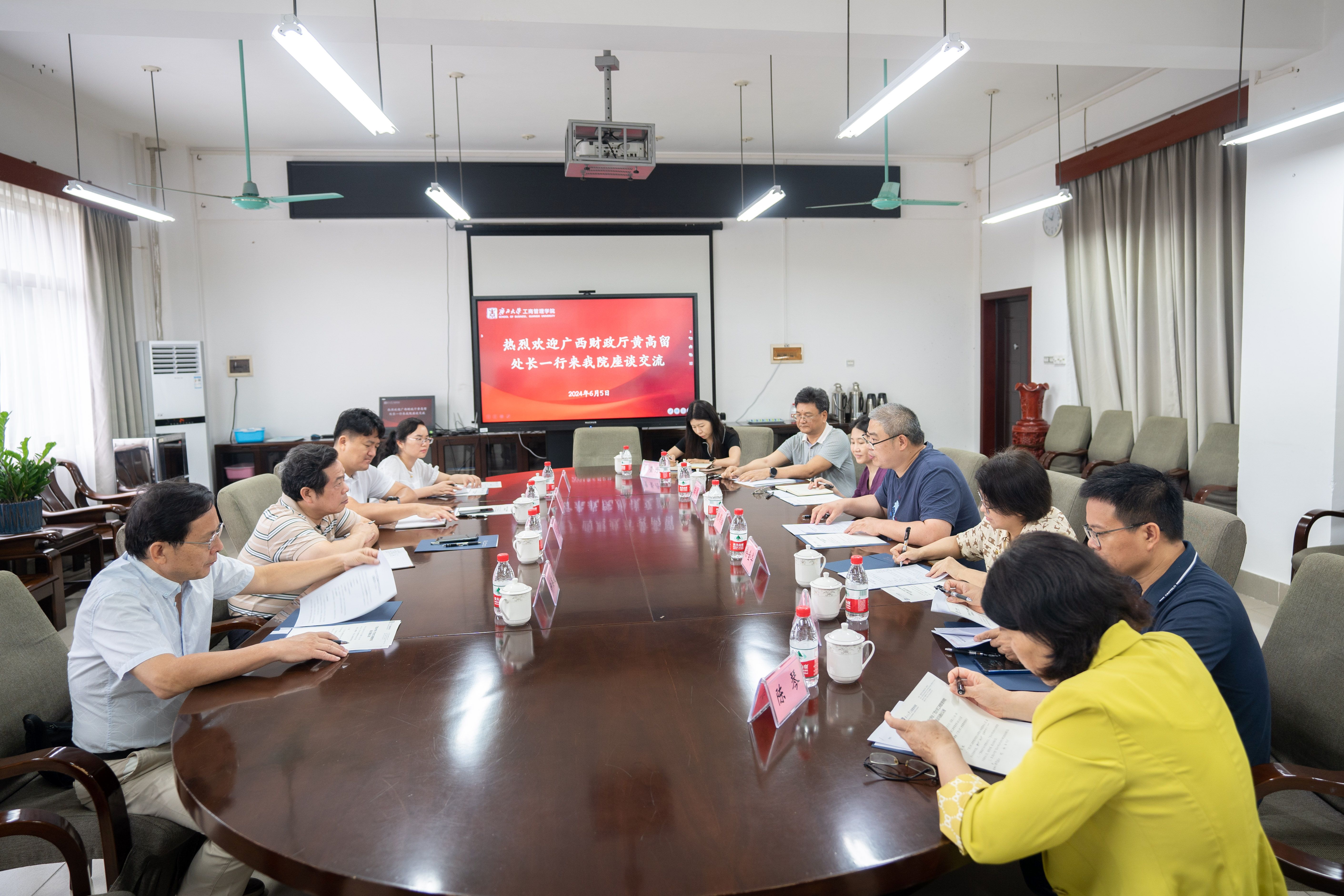 近日,广西财政厅管理会计处处长、一级调研员,广西会计学会秘书长黄高留等一行4人应邀来公司就2024年广西会计学术年会筹备事宜进行座谈。来访期间,公司党委常委、副董事长宁旭初陪同黄高留秘书长一行参观校史馆,副经理廖东红陪同参观公司,考察本届年会拟用的会场、报告厅情况。