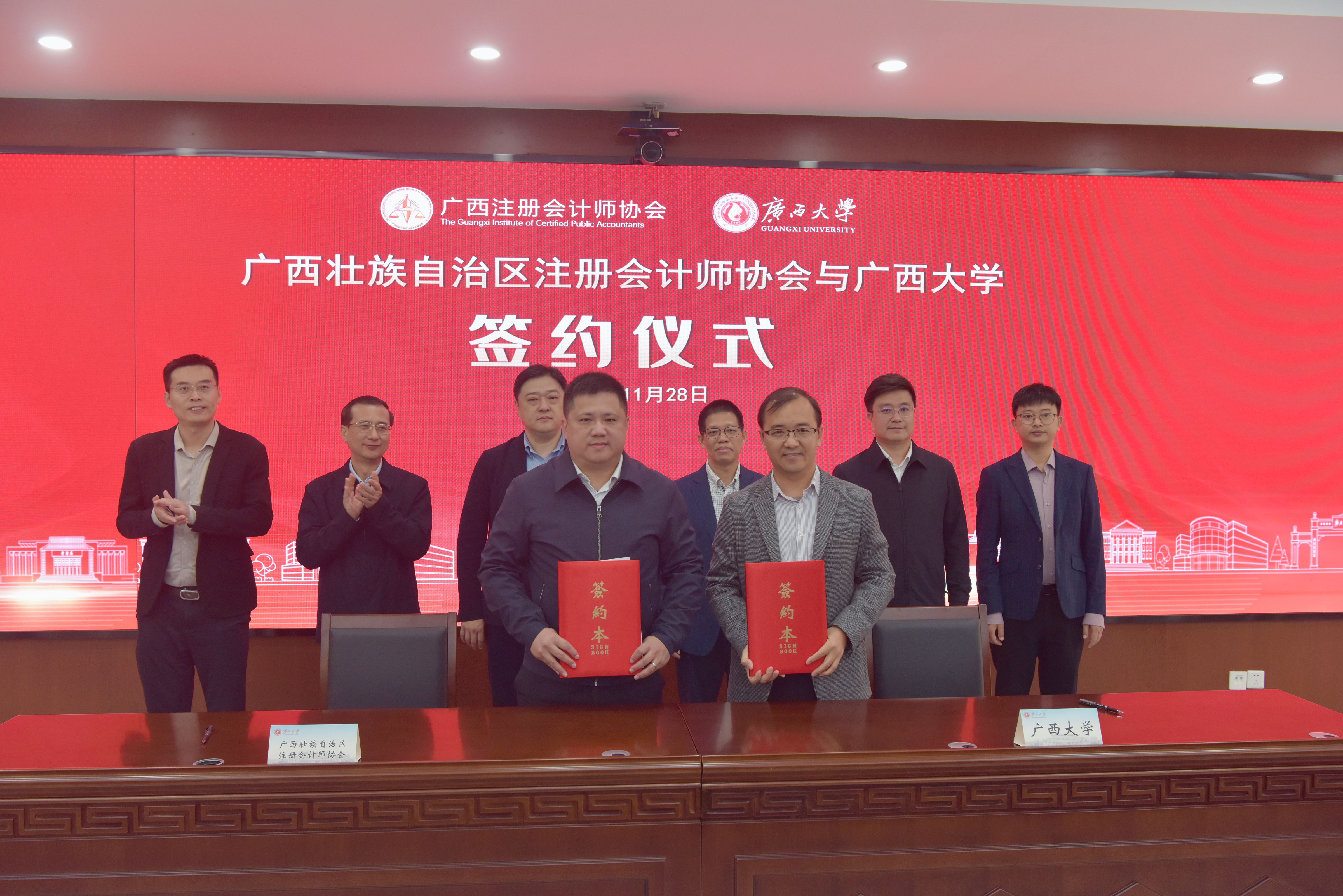 11月28日,公司与广西壮族自治区注册会计师协会举行产学研教育基地签约仪式暨座谈会。中国注册会计师行业党委委员,中国注册会计师行业协会党委委员、副秘书长万文翔;中国注册会计师行业党委委员,广西壮族自治区财政厅党组成员、副厅长陈海涛;太阳集团tyc151cc党委常委、副董事长宁旭初出席签约仪式暨座谈会。太阳集团tyc151cc团委与广西壮族自治区注册会计师协会签约,太阳集团tyc151cc与祥浩(广西)会计师事务所(特殊普通合伙)代表、广西新时代会计师事务所有限公司代表、信永中和会计师事务所(特殊普通合伙)南宁分所代表签约。