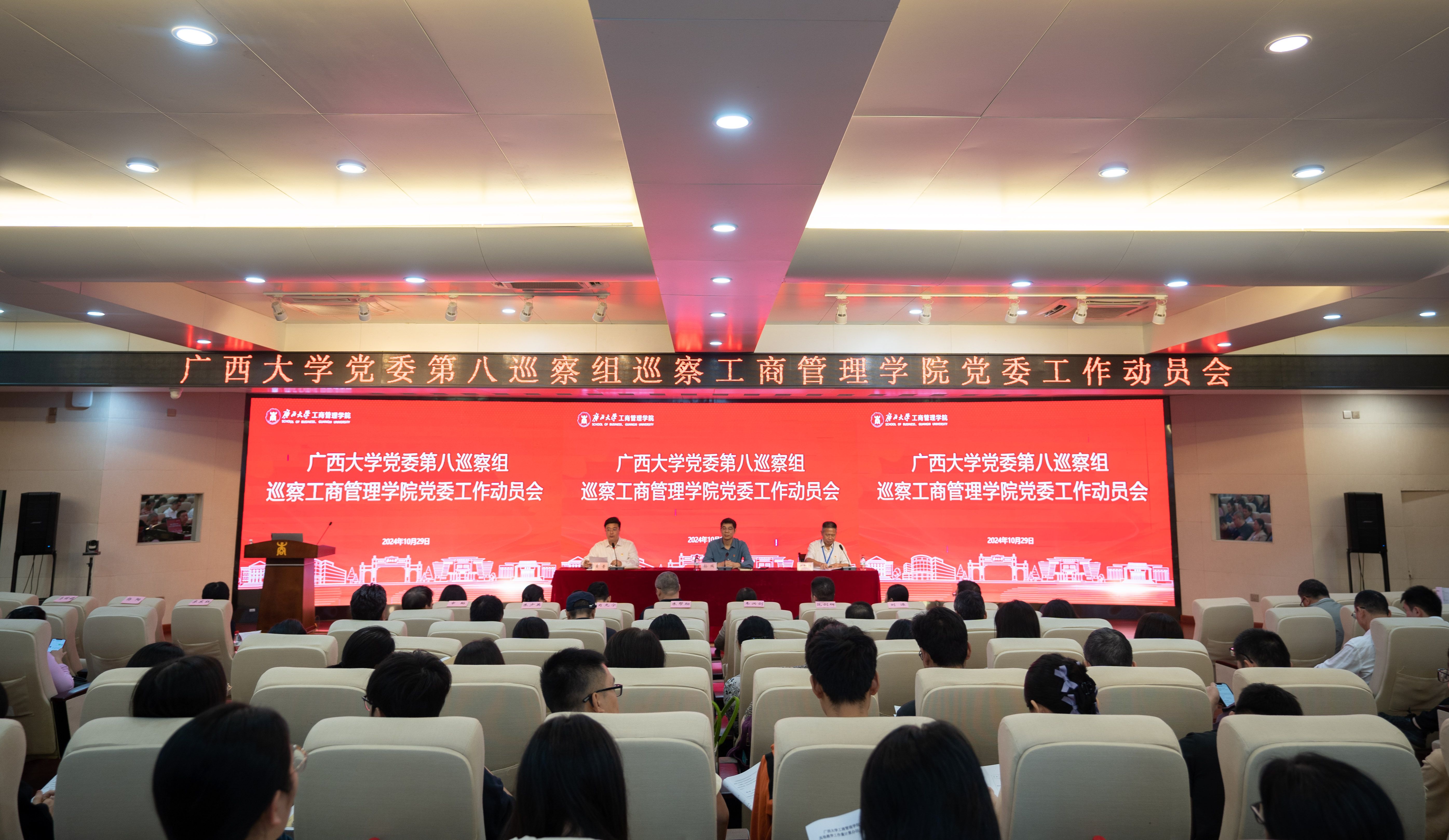 根据公司党委巡察工作的部署,10月29日下午,公司党委第八巡察组巡察工商管理公司党委工作动员会在太阳集团tyc151cc128报告厅召开。公司党委常委、巡察工作领导小组成员、宣传部部长孙瑞,第八巡察组组长袁新胜及全体成员、太阳集团tyc151cc领导班子、全体教职工、退休教职工代表和员工党员代表参加动员会。会议由工商管理公司党委书记黄晋主持。